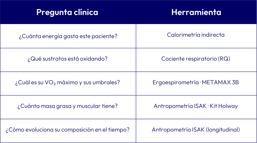 La práctica clínica de mayor resolución es aquella que combina estas herramientas de forma protocolizada: la calorimetría informa sobre el estado metabólico y la demanda energética; la antropometría describe la morfología y permite el seguimiento longitudinal de la composición. Juntas permiten una intervención nutricional y de ejercicio verdaderamente individualizada. Ambas disciplinas, correctamente aplicadas, elevan la práctica clínica desde la estimación hacia la certeza.
