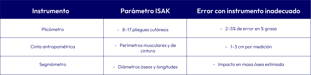 La antropometría estandarizada ISAK es el método de referencia mundial para medir composición corporal en clínica y deporte. Pero su precisión depende directamente de la calidad del instrumental. Un plicómetro descalibrado puede introducir un error de 3–5 puntos porcentuales de masa grasa —suficiente para tomar decisiones equivocadas. La precisión del instrumento no es un lujo; es una condición de validez del método.