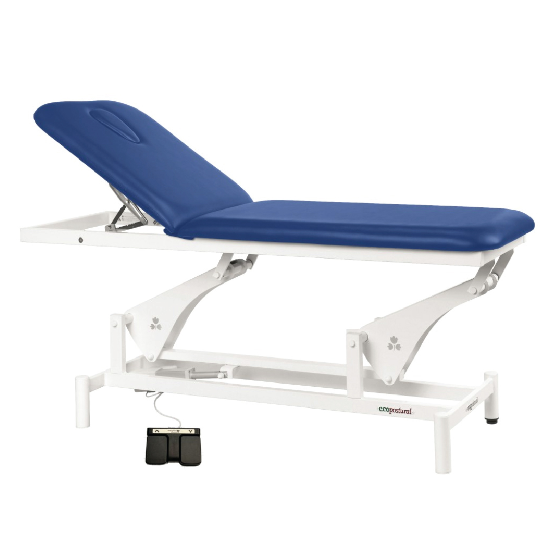 Camilla eléctrica 2 cuerpos de desplazamiento lateral de estructura color blanco, camilla de espuma de firmeza media de 5 cm de espesor con portarollo. Incluye taburete.