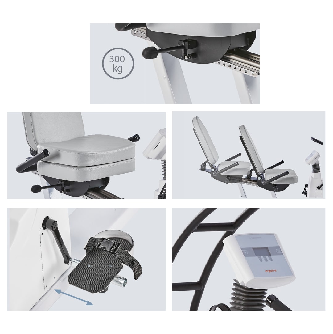 Cicloergómetro reclinado Ergoselect 600 de Ergoline tiene un respaldo ajustable en 3 posiciones y pedales con regulación lateral para adaptarse a a cada paciente.