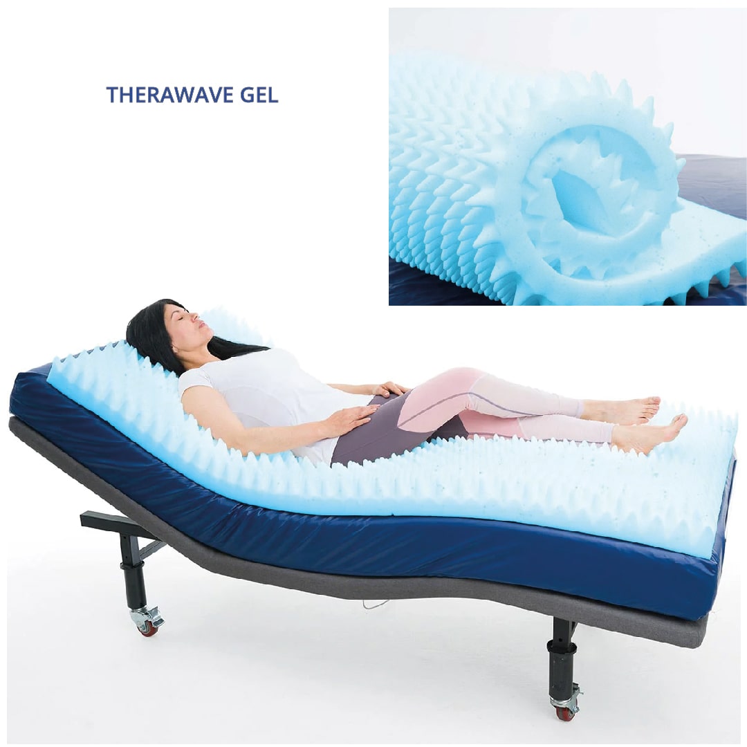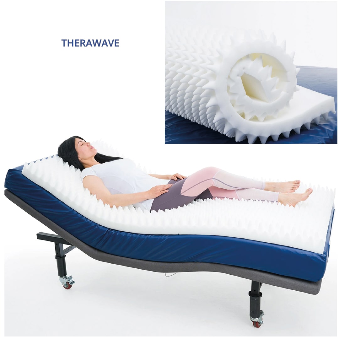 - Therawave: Topper o cubre colchón con puntas ondeadas tipo «cascarón de huevos» de espuma de alta densidad que alivia los puntos de presión. Máxima 77kg.
