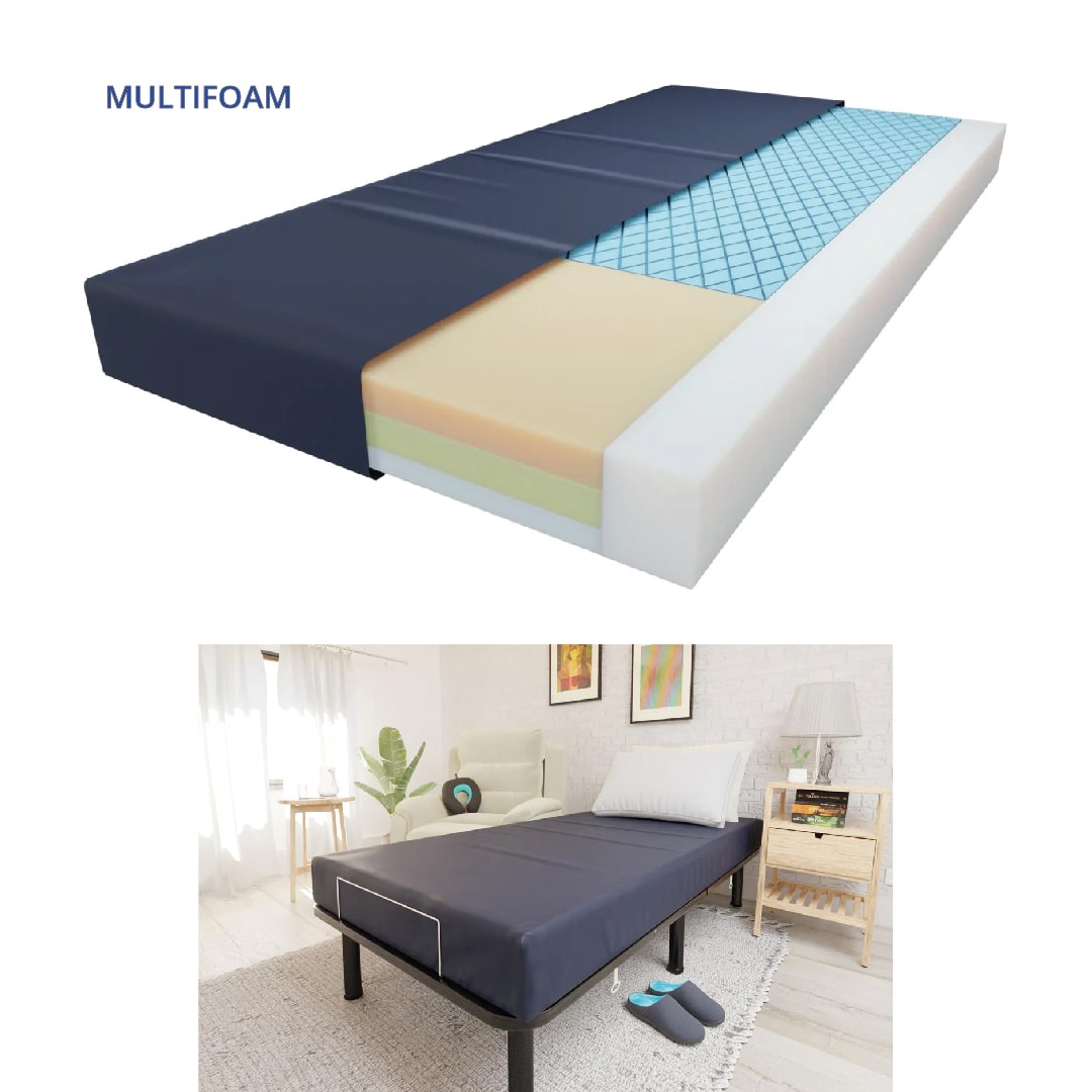 - Multifoam: Colchón con 4 espumas de alta densidad, media, viscoelástica y gel con talonera Multifoam que amortigua el peso de úlceras por presión en pies. Máxima 136kg.