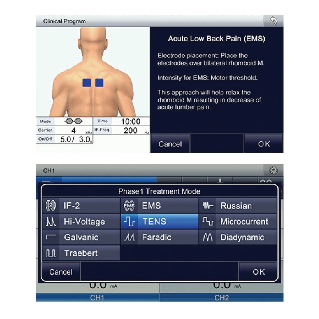Electroterapia de 2 canales independientes y diagrama corporal instalado con 28 programas clínicos preprogramados para más de 20 tipos de patologías típicas.
