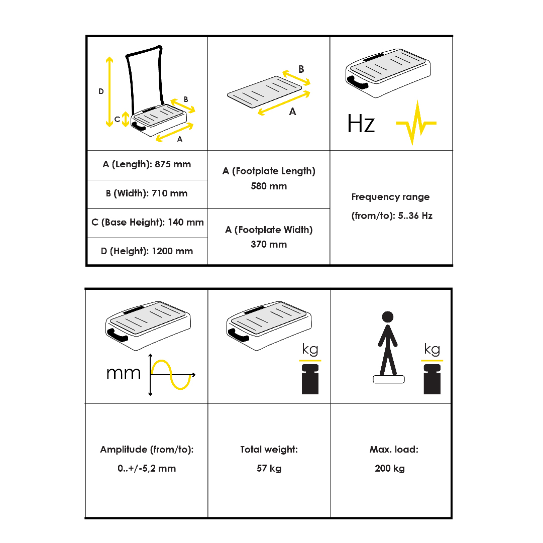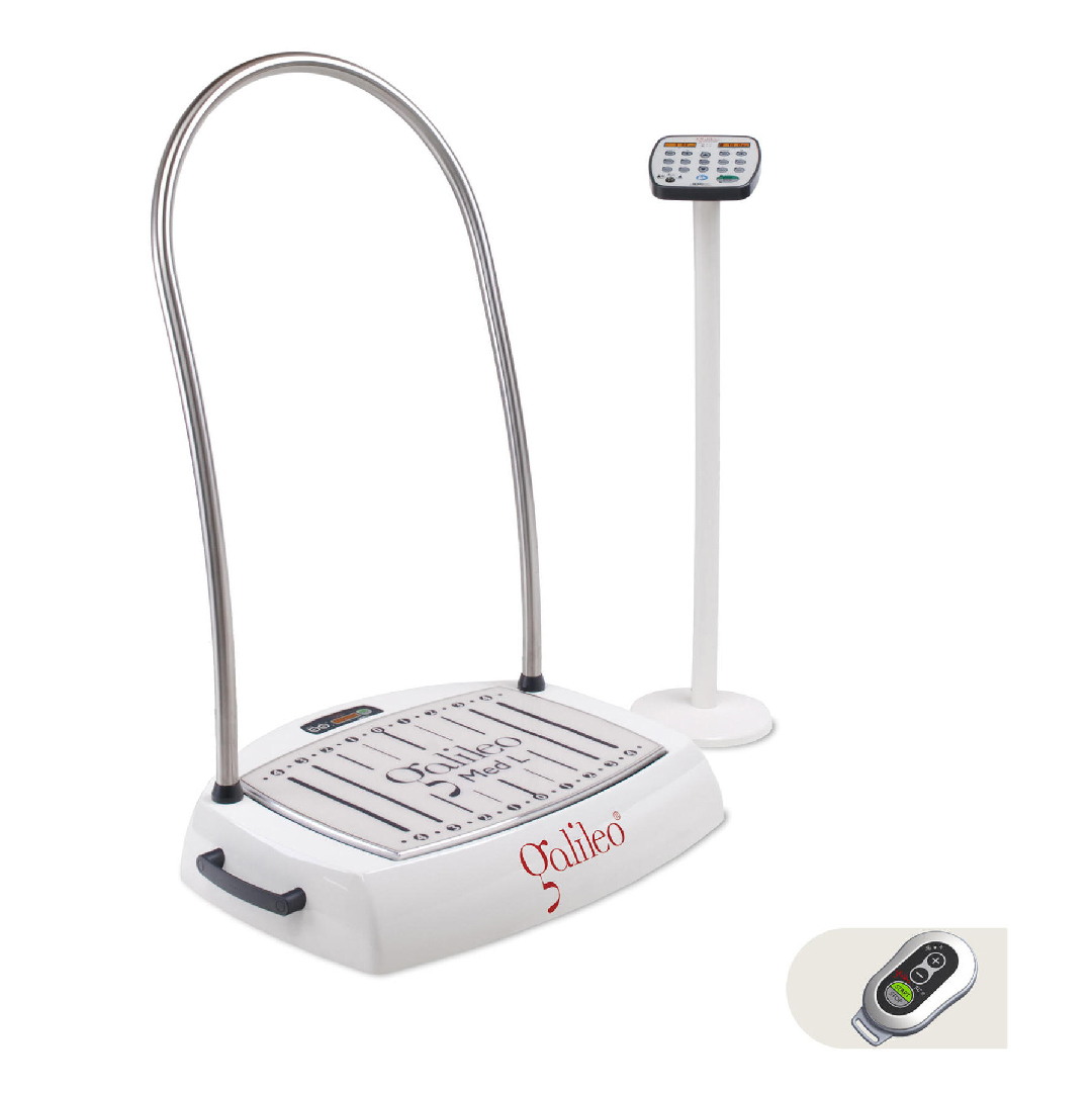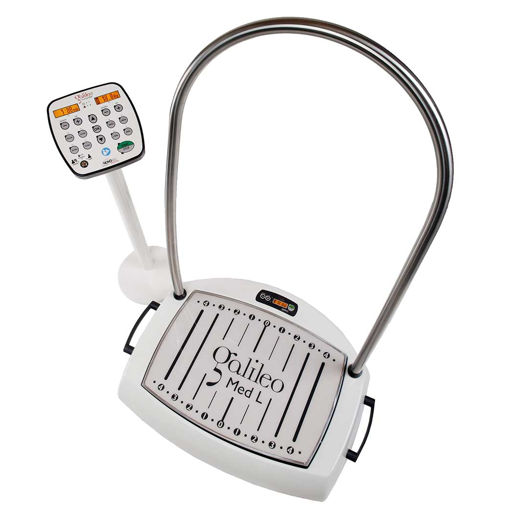 Plataforma de Vibroterapia Galileo Med L de gran tamaño y amplitud es ideal para aplicaciones terapéuticas mediante vibraciones alternantes laterales que imitan los movimientos naturales del caminar humano. Este modelo incluye con barra de sujección, a ambos lados del equipo para máxima seguridad al paciente, soportando hasta 200 kg.