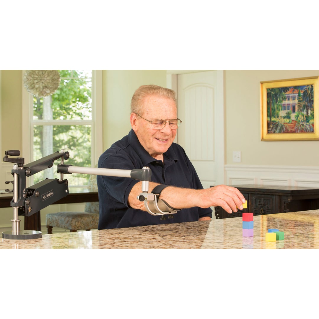 Saebo masmini es el sistema de soporte de gravedad «0» para miembro superior dinámico, diseñado para ayudar al paciente a utilizar su propia fuerza muscular y realizar movimientos de hombro y codo de forma precoz durante tareas funcionales y ejercicios.