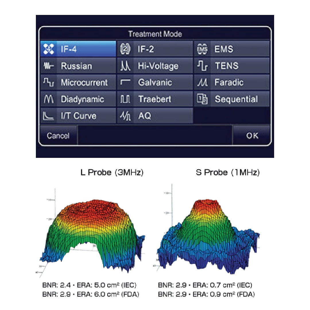 • CA: IF-4, IF-2, EMS, ruso, TENS, alto voltaje (HV), microcorriente (MCR)