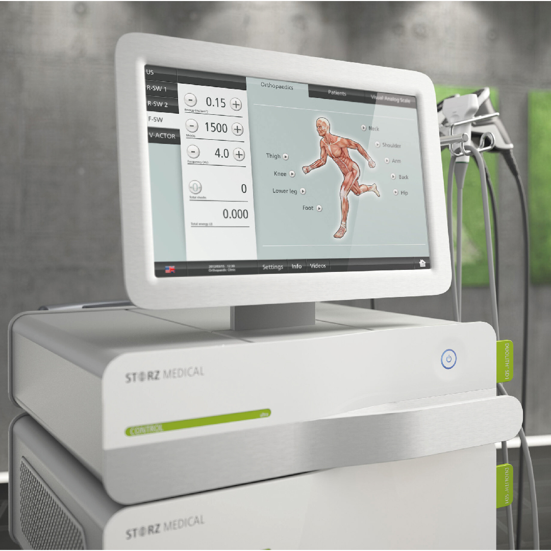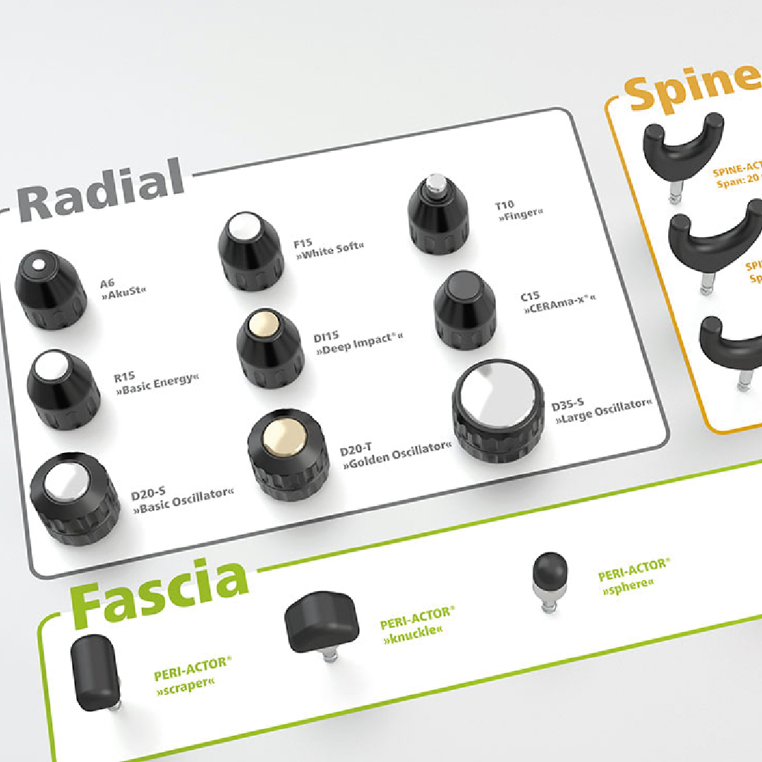 | Módulo radial FALCON opcionales | tratamiento vibratorio opcional con el aplicador V-ACTOR® »HF« y la terapia de vacío opcional con la tecnología VACU-ACTOR® complementan el tratamiento con ondas de choque perfectamente. |
