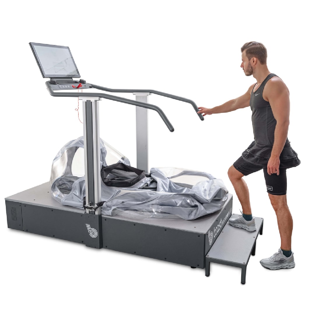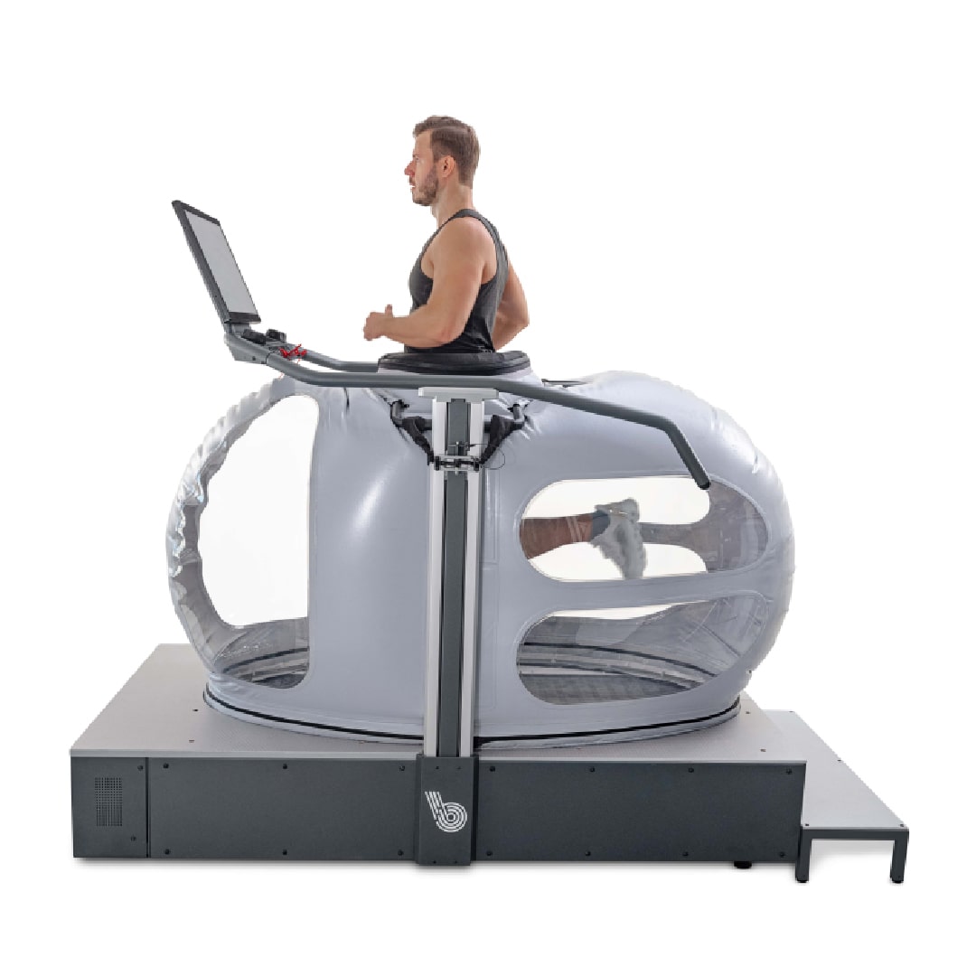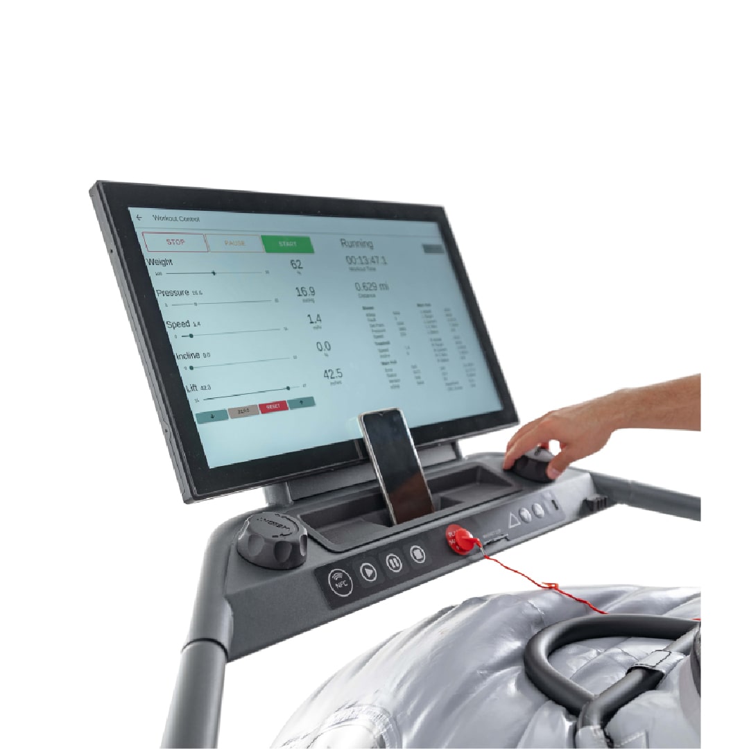 - Reducción del peso corporal efectivo permite ajustar el peso desde el 100 % hasta un 20 %, en incrementos del 1 %. Esto se logra mediante un sistema de presión que genera una fuerza de elevación, contrarrestando la gravedad y distribuyendo el alivio por toda la parte inferior del cuerpo, lo que brinda una sensación de caminar o correr de forma natural, rápida y sin dolor.